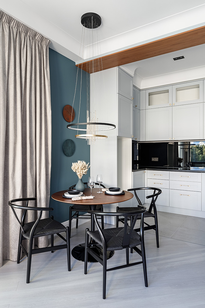 В стиле неоклассики выполнена еще одна квартира в доме "AQUAMARINE". Классические формы мебели, полиуретановые карнизы и плинтуса, классические мебельные фасады соседствуют в нем со светильниками ультрасовременной формы. Уже ставшие классикой стол Tulip и стулья Wishbone создают гармоничную композицию с эффектным светильником-подвесом над столом.