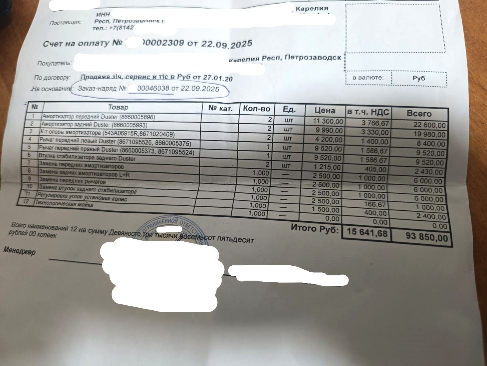 Выяснилось, что в его внедорожнике все с подвеской очень плохо. Амортизаторы, рычаги и много чего еще никуда не годятся. И к сумме за масло и его замену ему предложили обязательный ремонт подвески на почти 94 тысячи рублей. В общей сложности, поездка в этот центр рисковала обойтись в 100 тысяч. Даже не для пенсионера это большая сумма, а для неработающего ветерана труда такой чек оказался и вовсе неподъемным.