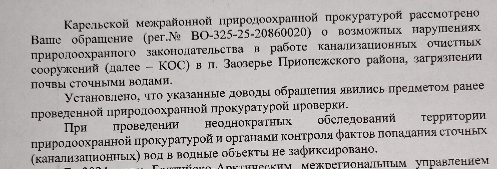 Активисты движения провели собственную проверку, и ее результаты сильно отличаются от выводов надзорных органов: «Из-за отсутствия электричества они (КОС — ред.) не функционируют уже 11 лет, и канализация сливается в Логмозеро, а затем в Онежское озеро. В 2023 году местные жители обратились на прямую линию с президентом РФ. В апреле 2024 года Следственный комитет начал расследование».
