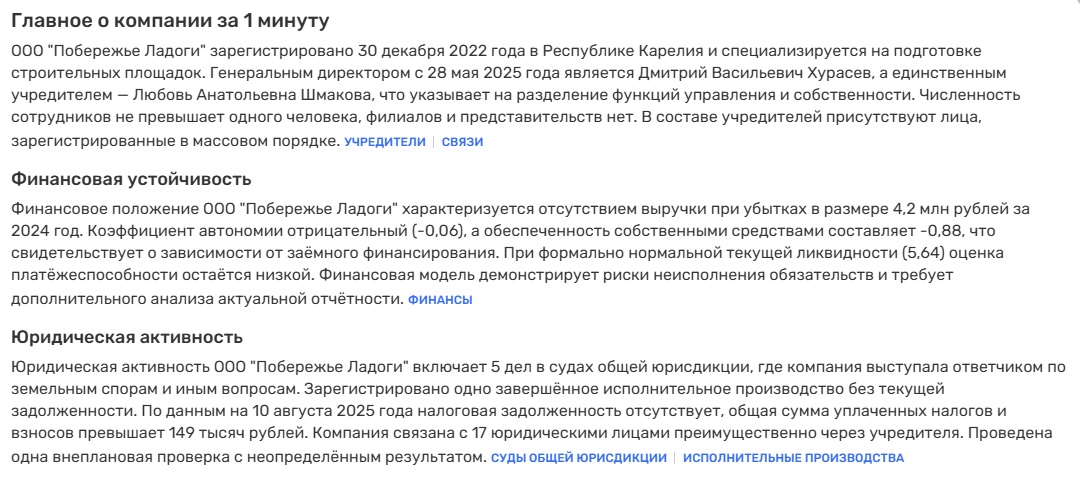 Участок, на котором ведется строительство, по документам принадлежит ООО «Побережье Ладоги». Согласно сведениям, полученным с помощью сервиса проверки и анализа контрагентов Rusprofile, эта компания появилась на свет 30 декабря 2022 года, учредители — местные бизнесмены, занимающиеся овцеводством. Но в феврале 2024 года в состав учредителей вошла некая Любовь Шмакова. Сейчас она единственный учредитель этой компании. Человек она широкой общественности не известный. Зато ее сын периодически попадает в медиапространство.