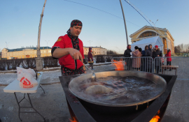 Шеф-повар Антон Калинин в честь открытия ярмарки сварил горячий глинтвейн с корицей, мятой, гвоздикой, апельсинами, имбирем и другими ингредиентами. Угощают напитком всех абсолютно бесплатно.