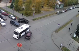 Видно, что автомобиль хотел развернуться, но его маневра не заметил водитель автобуса, который ехал по улице Кирова. Об аварии рассказали в паблике «Городской транспорт» в телеграм-канале предприятия. Именно оно обслуживает городской маршрут № 18.
