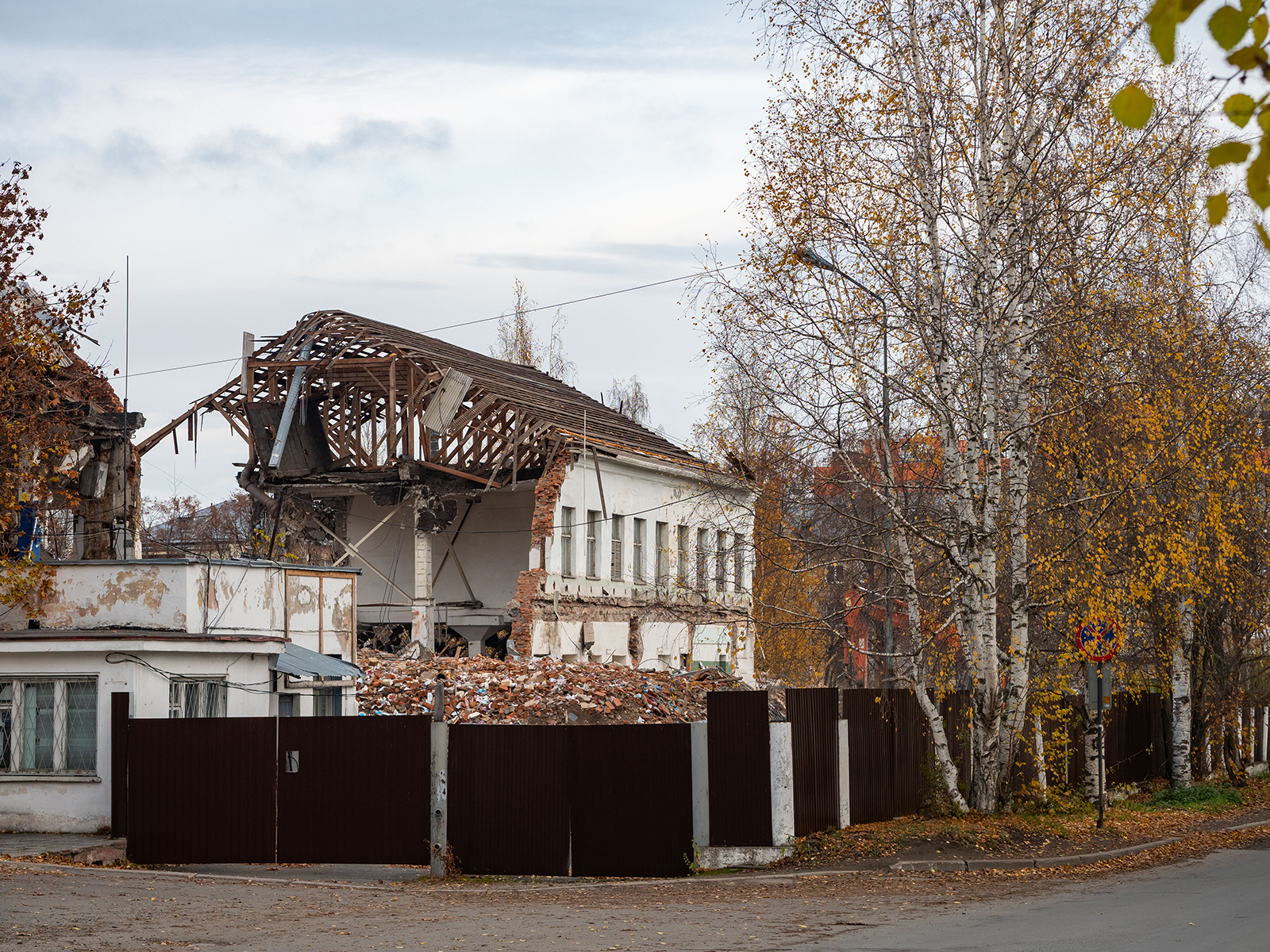 На перекрестке улиц Вольная и Кирова в Петрозаводске продолжается снос зданий бывшего завода «Холод-Славмо», который после банкротства был продан на торгах.
