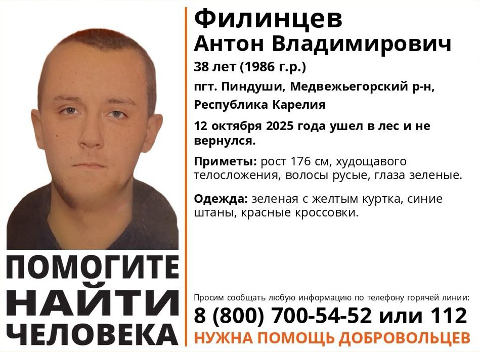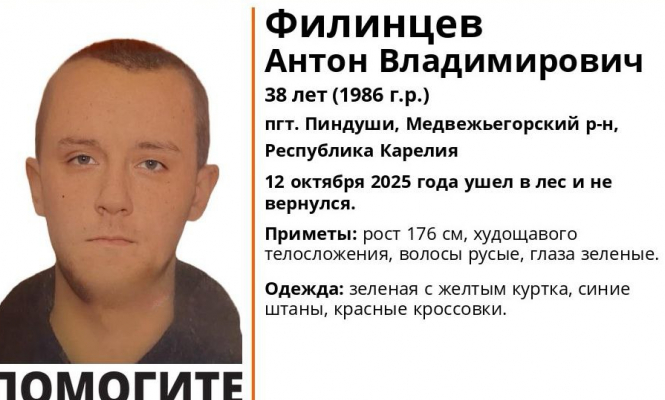 В Медвежьегорском районе разыскивают 38-летнего жителя посёлка Пиндуши Антона Филинцева, который в течение суток не выходил на связь. Об этом сообщили в группе карельского отделения поисково-спасательного движения «ЛизаАлерт». 12 октября мужчина ушёл в лес и не вернулся домой.