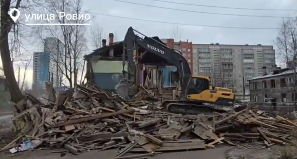 Демонтаж ветхих зданий выполняет специализированный застройщик «Карельский 5». Работы проводятся в рамках программы Комплексного развития территорий.