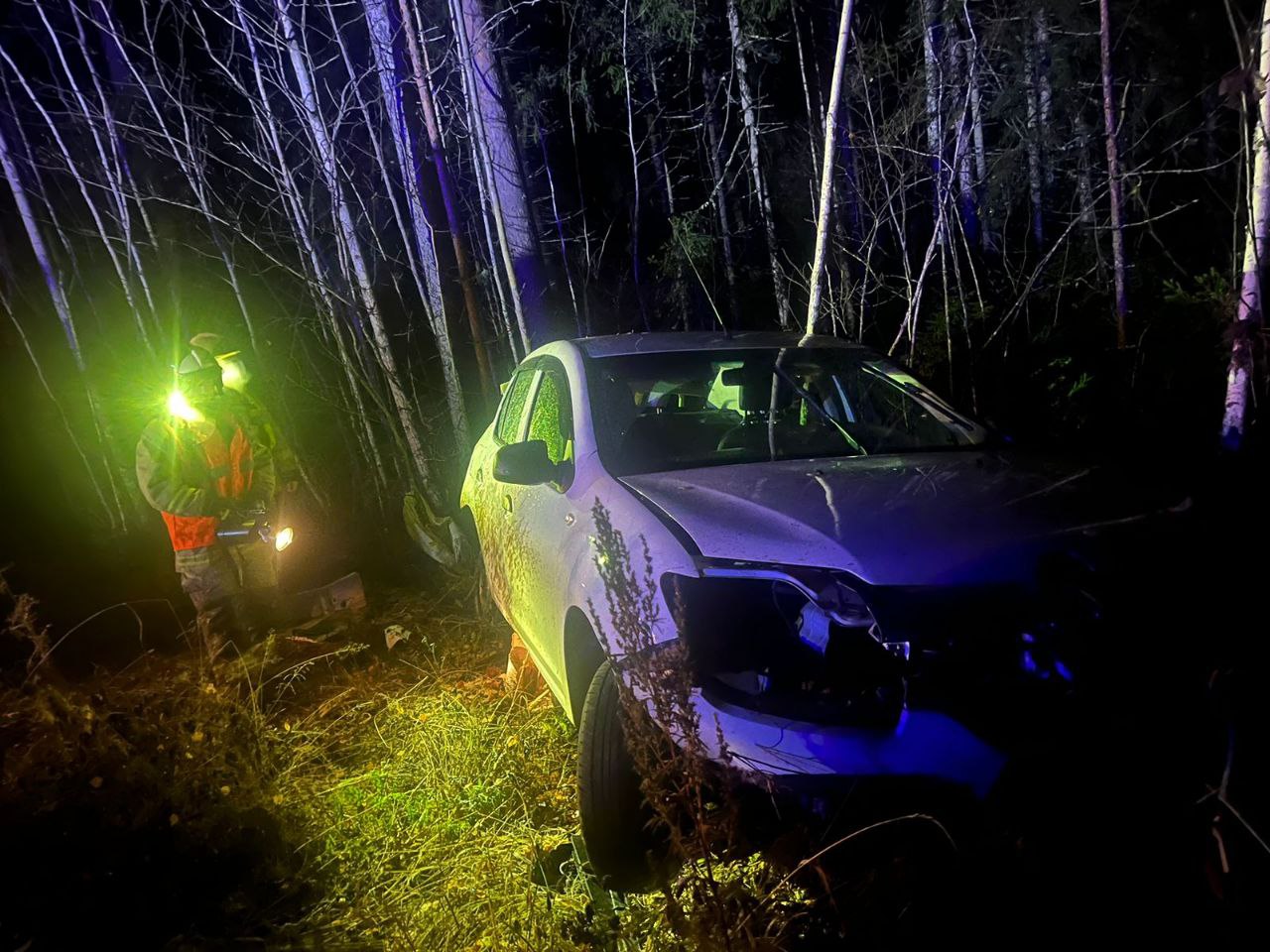 Автомобиль вылетел с дороги на Пиньгубском шоссе возле Петрозаводска и повис на дереве. О ДТП сообщили в Госкомитете Карелии по ОЖ и БН.