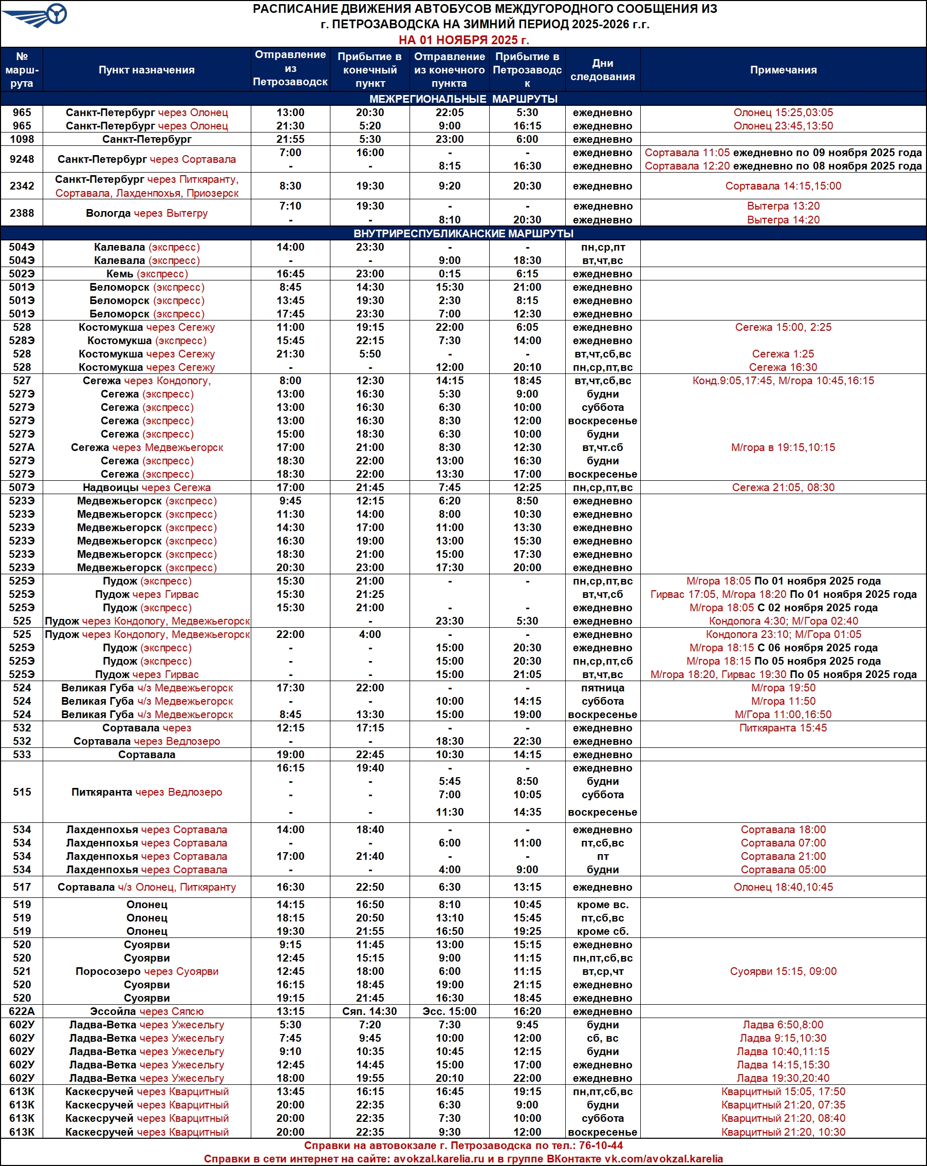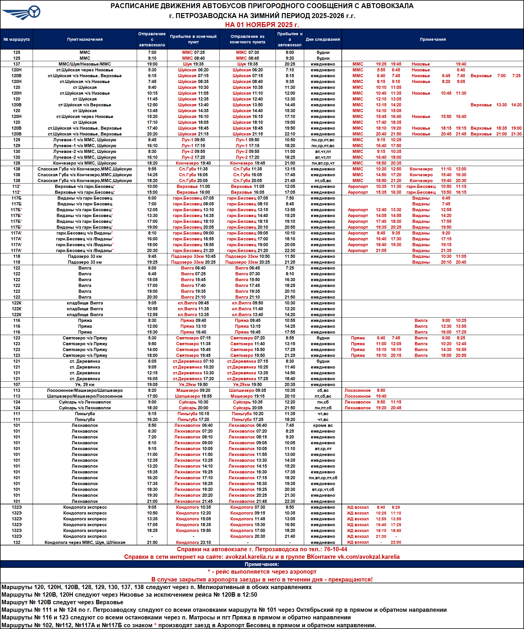 С 1 ноября 2025 года автовокзал Петрозаводска переходит на зимнее расписание.