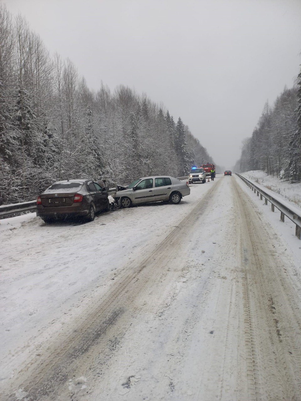 Два автомобиля лоб в лоб столкнулись на федеральной автодороге в Карелии.