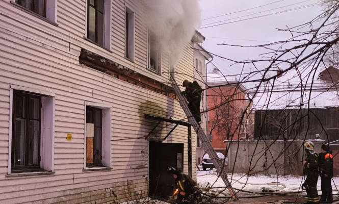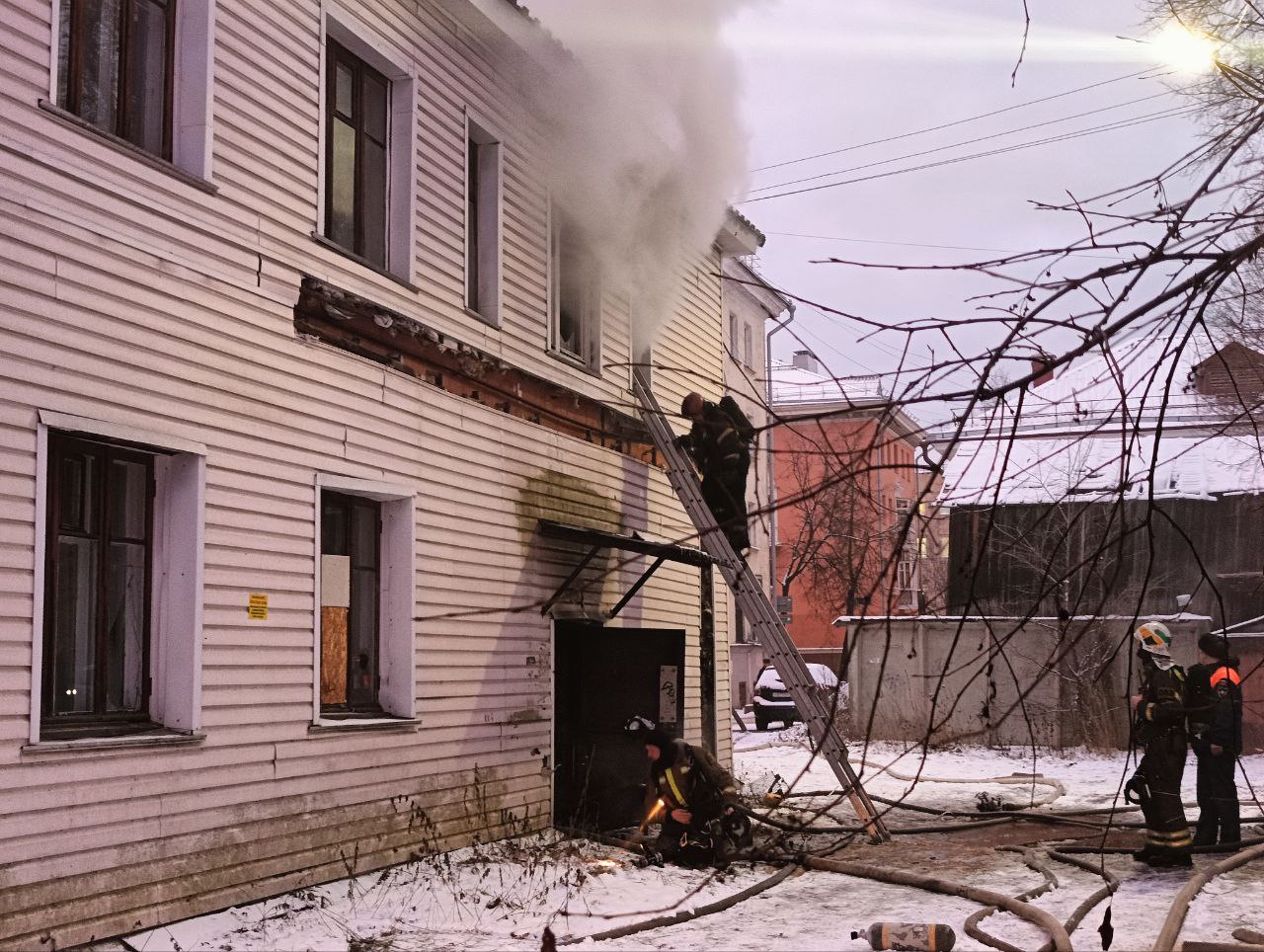 На улице Гоголя, 3б в Петрозаводске горит двухэтажный дом. Пламя охватило одну из квартир и чердак.