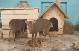 Новорождённый оленёнок из Карельского зоопарка делает первые шаги под присмотром родителей.