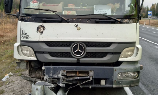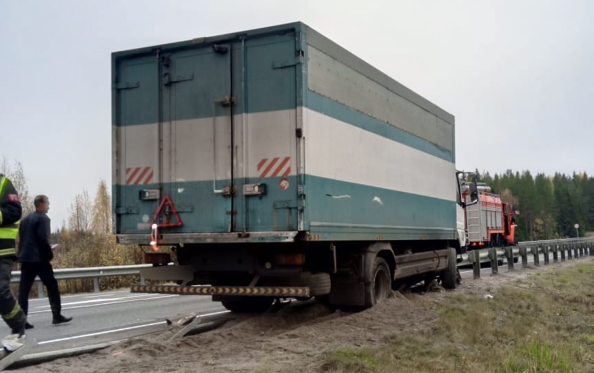 Утром 9 октября в Пряжинском районе Карелии большегруз налетел на отбойник.