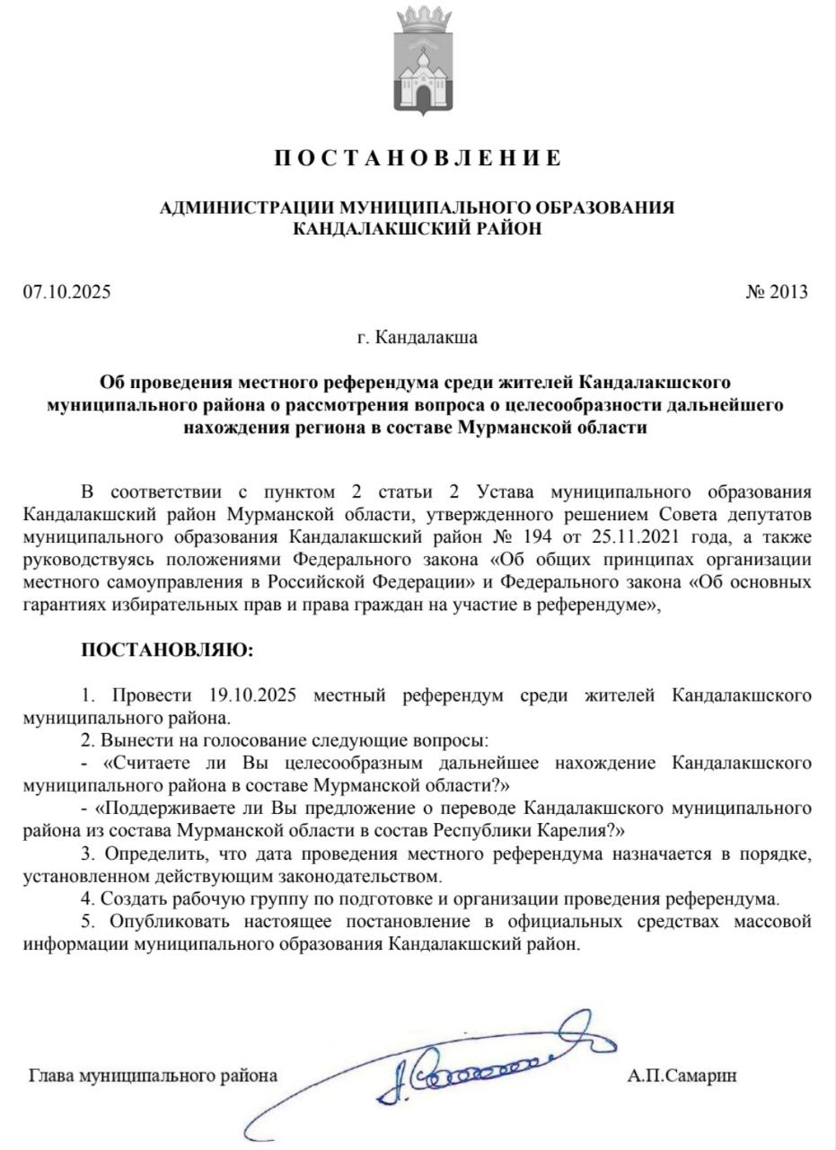 Сегодня, 7 октября, на почту «Столицы на Онего» пришло письмо с информацией о том, что 19 октября в Кандалакшском районе Мурманской области будет проходить местный референдум «О целесооборазности дальнейшего нахождения в составе региона» и присоединении к Республике Карелия. Соответствующий документ, отправленный якобы от имени главы Кандалакшского района Александра Самарина, находится в распоряжении агентства.