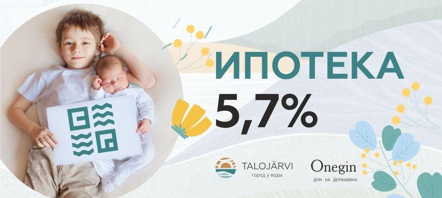 Ставка 5,7% работает по программе «Семейная ипотека» и ей можно воспользоваться при покупке квартиры в новостройках: Жилой комплекс «Онегин» и Жилой квартал «Talojarvi» город у воды.