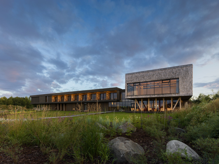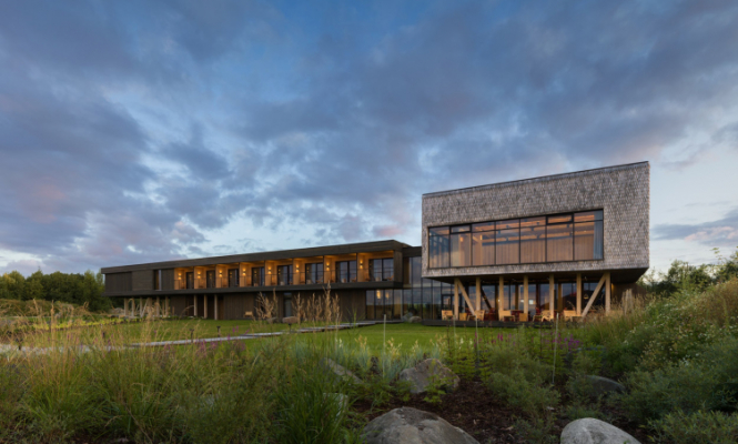 Отель «Заонежье», созданный архитектурным бюро Rhizome для территории на берегу Онежского озера, представляет собой комплекс из двух гостевых домов, сауны и главного здания с залом для йоги. Особую ценность проекту придает использование традиционных материалов и технологий — фасады облицованы гонтом (кровельный материал в виде деревянных или других пластин, а также отдельный элемент гибкой черепицы — прим. автора), который изготовили и установили реставраторы, работавшие над церквями острова Кижи, сообщает «Архи Ру».