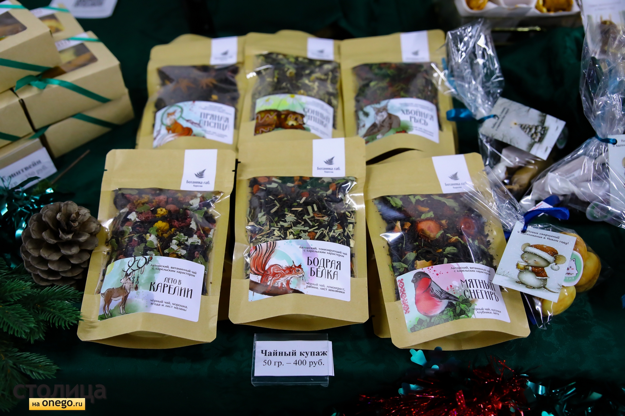 Рядом — стол с чаями и глинтвейнами из карельских трав и ягод. Продавец Нина рассказала, что сама собирает травы и ягоды по Карелии и делает из них бодрящие, витаминные и успокаивающие смеси. У нее целый «зверинец» — каждый чай носит имя животного и отражает его характер: «Бодрая белка» с рябиной и листьями земляники, «Зимний снегирь» с карельской клубникой, собранной на шуйских полях, «Хвойная рысь» с можжевельником и брусникой, «Пряная лисица» с клюквой и корицей, которая по настроению напоминает глинтвейн. К Новому году Нина готовит и специальные глинтвейновые наборы — чтобы можно было согреться дома и подарить тепло близким.
