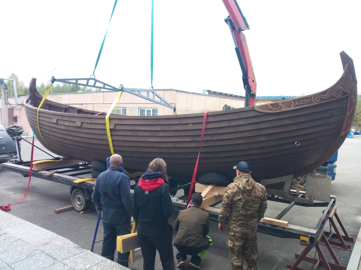 Длина ладьи, выполненной из карельской ели и сосны, достигает 10 метров.