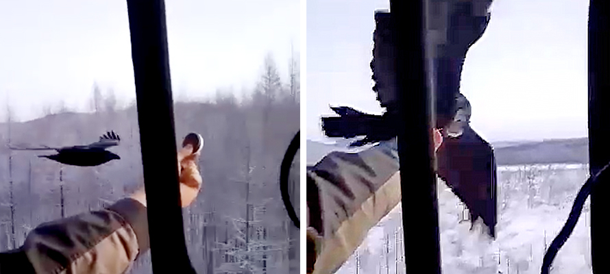 На видео ворон на лету хватает угощение, которое ему протягивают машинисты из окна движущегося поезда. По словам авторов видео, скорость поезда в этот момент составляла 58 км/час.