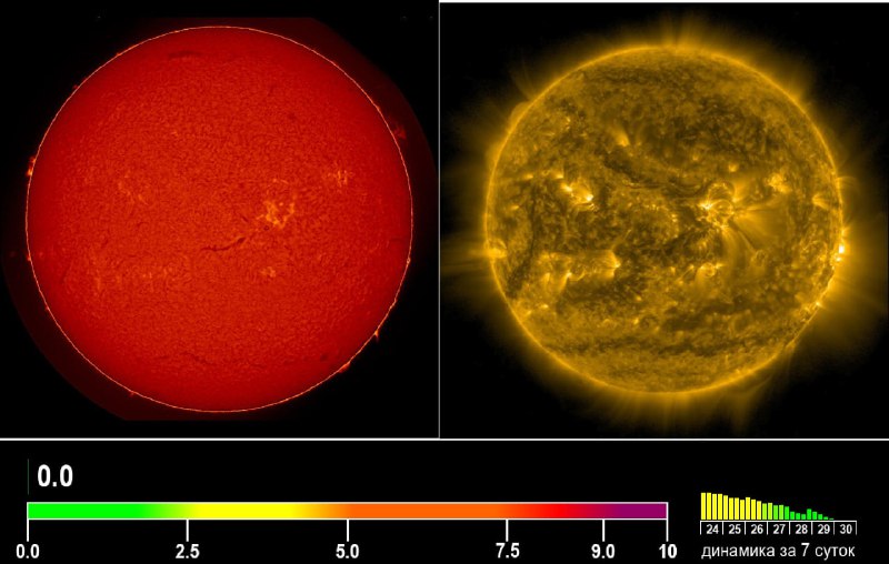 — Солнце с начала года продолжает подавать противоречивые сигналы о состоянии своей активности. Периоды сильных вспышек, продолжающиеся неделю и более, всего за 1-2 дня сменяются «мёртвыми сезонами», которые также могут длиться неделями. (…) Так, последний раз в ноль индекс вспышечной активности уходил 3–4 апреля 2024 года, а всего через месяц, в мае 2024 года, на звезде произошёл один из крупнейших в истории всплесков активности, впервые за 20 лет сопровождавшийся магнитными бурями высшего пятого уровня, — рассказали там.