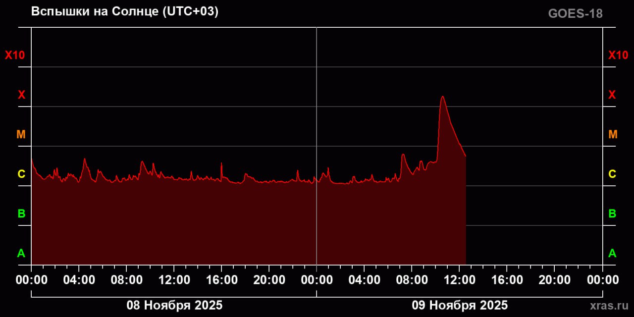Сегодня, 9 ноября, в 10:35 на Солнце произошёл взрыв высшего уровня — Х1.79. Выброшенная звездой плазма уже движется в сторону Земли, сообщили в Лаборатории солнечной астрономии ИКИ РАН.