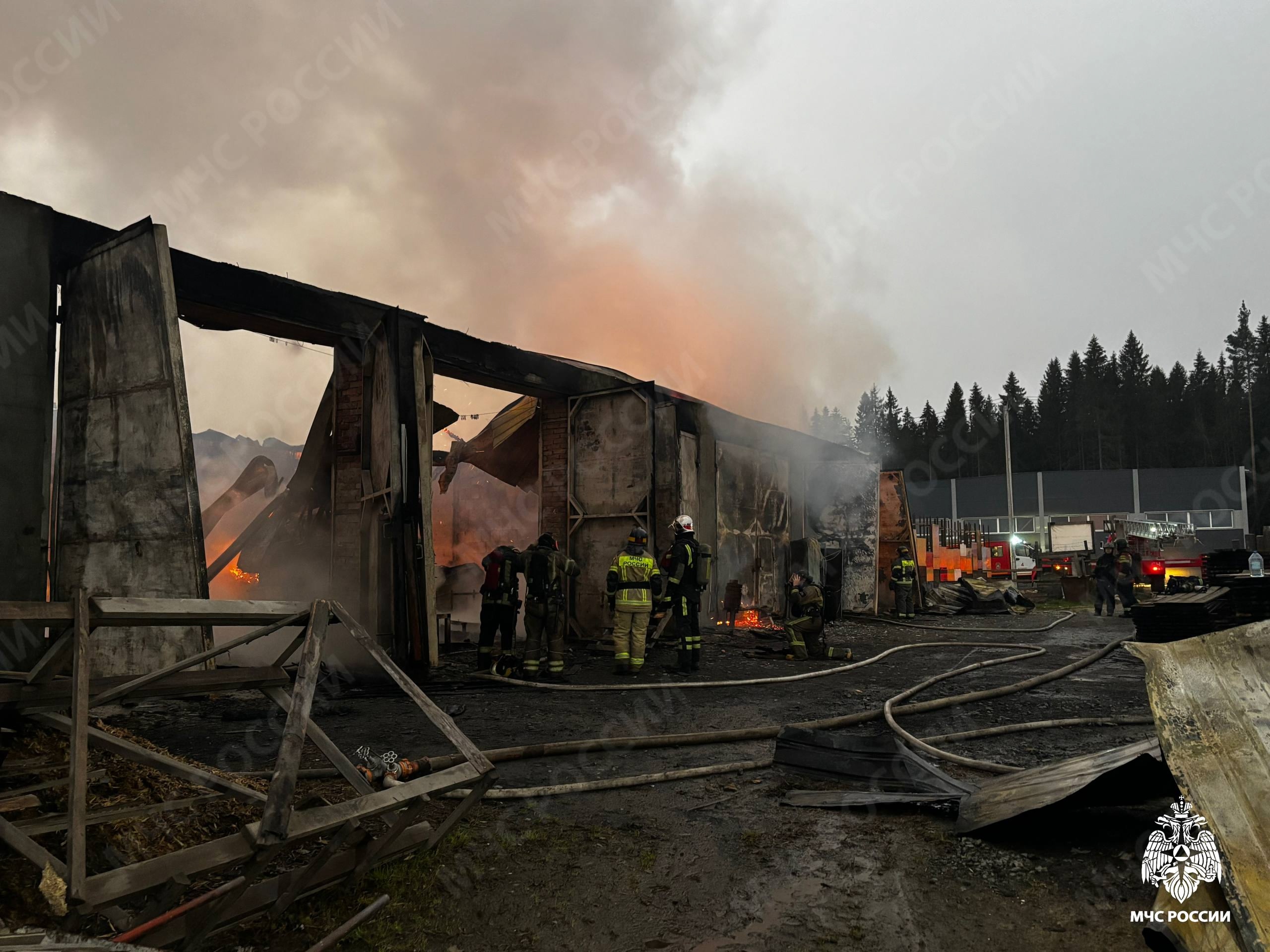 На место происшествия выехали десять единиц пожарной техники и 28 спасателей. Специалисты локализовали огонь к 06:59 утра. По предварительным данным, пожар повредил 800 квадратных метров помещений.