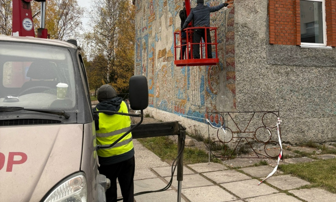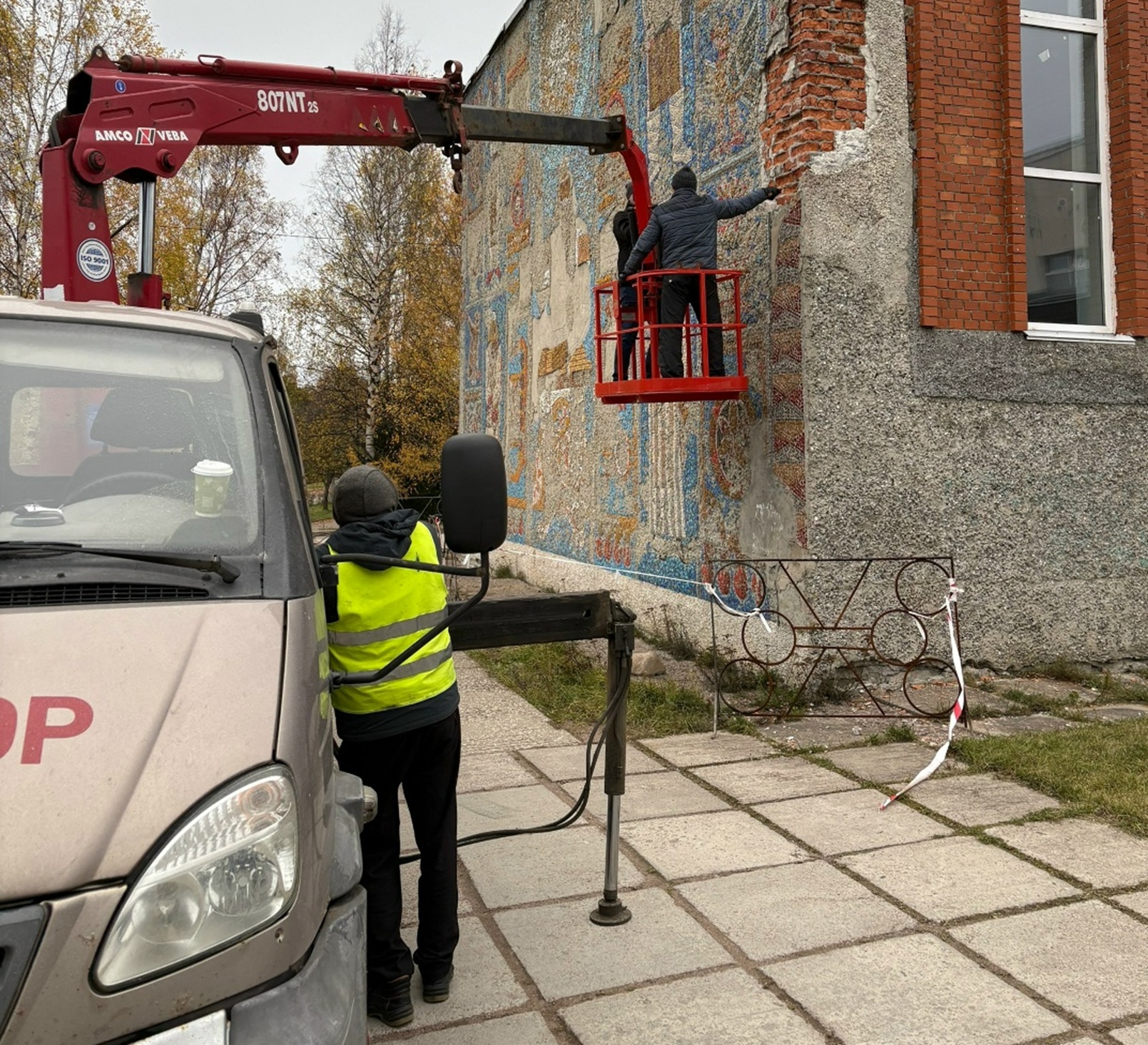 Сотрудники Академии им. А. Л. Штиглица простучали каждый метр мозаичного панно на Доме культуры в Питкяранте.