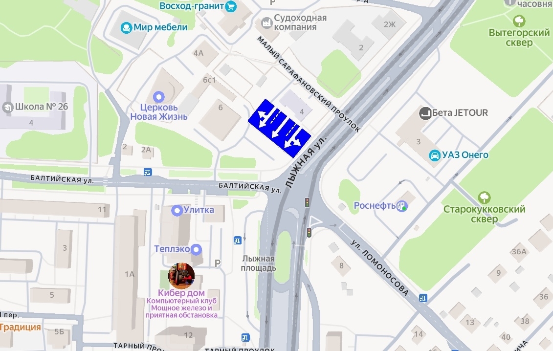 Первое изменение касается перекрестка Лыжной и Балтийской улиц. Теперь по направлению к улице Ровио с крайней правой полосы можно будет двигаться не только направо, но и прямо.