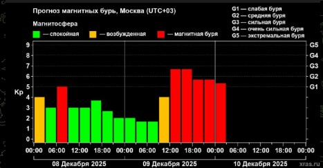 Во вторник и среду, 9–10 декабря, на Земле ожидаются магнитные бури уровня G2–G3 (средней и сильной интенсивности).