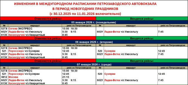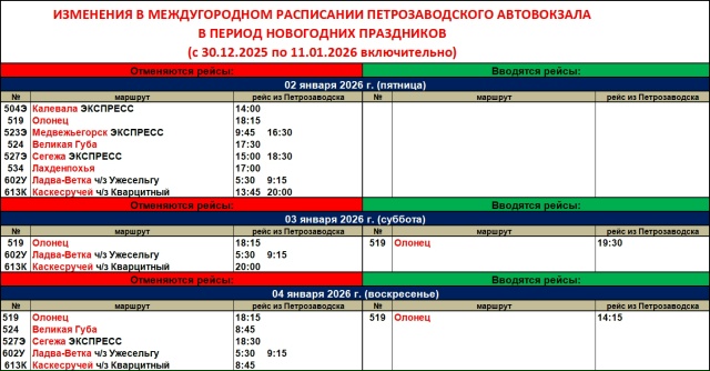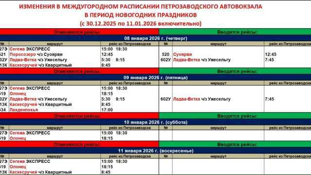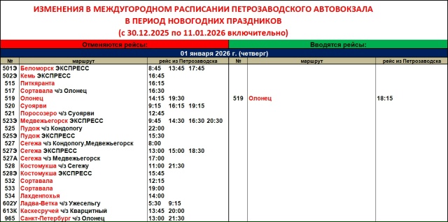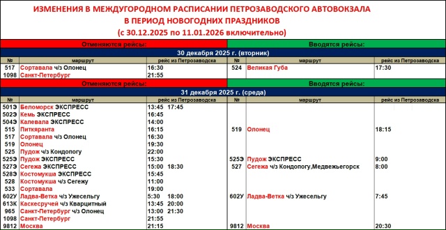 «Карелавтотранс» опубликовал обновленное расписание автовокзала Петрозаводска. Новый график будет действовать в период новогодних праздников — с 30 декабря 2025 года по 11 января 2026 года включительно.