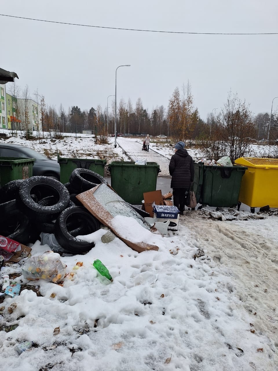 Родителям с детьми приходится протискиваться между грязными мусорными баками на местной контейнерной площадке, а потом ждать, пока проедут автомобили и пересекать проезжую часть на свой страх и риск. Пешеходного перехода там также нет.