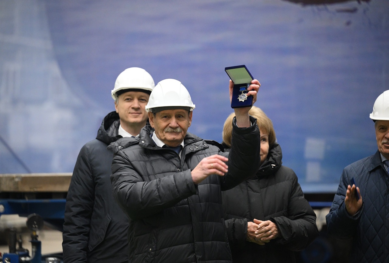 За высокие производственные достижения и многолетнюю плодотворную деятельность в судостроительной отрасли Николай Патрушев вручил директору завода Владимиру Майзусу медаль Морской коллегии Российской Федерации.