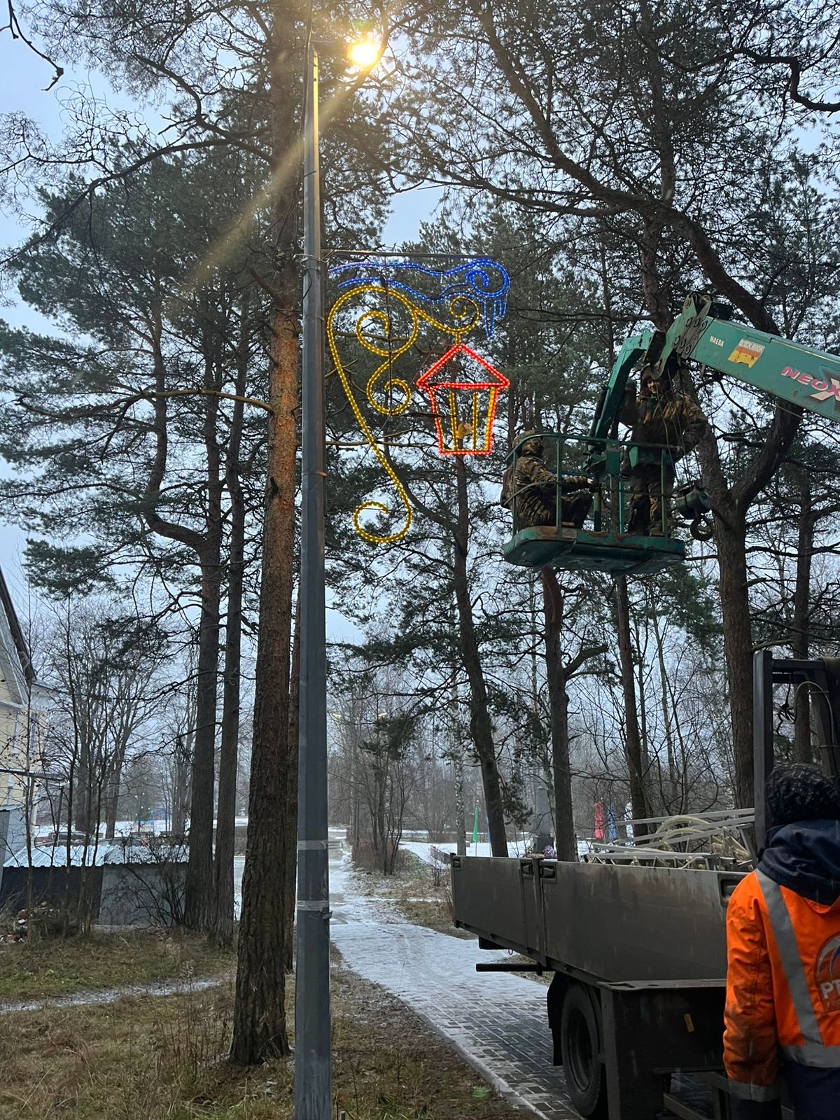 Подрядчики приступили к установке елей и к монтажу световых консолей в Петрозаводске.