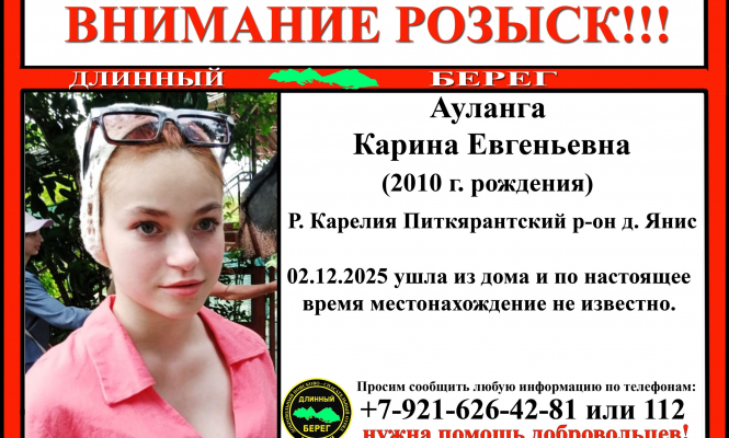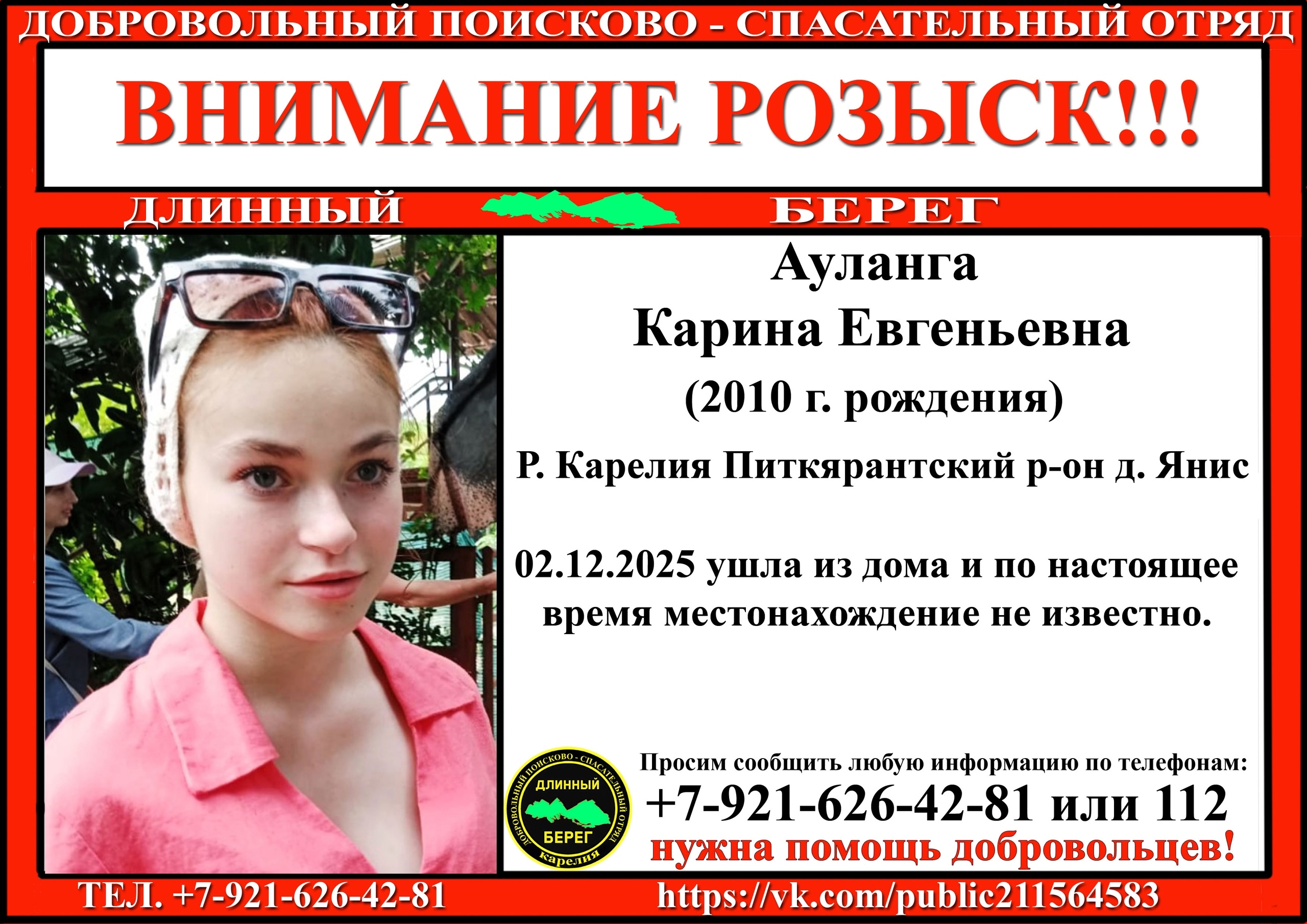 15-летняя Кристина Ауланга вновь разыскивается в Карелии. Девушка ушла из дома в деревне Янис Питкярантского округа 2 декабря. О ее мостонахождении ничего не известно. Об этом сообщил поисковый отряд «Длинный берег».