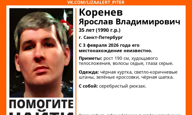 3 февраля в Санкт-Петербурге пропал 35-летний местный житель Ярослав Коренев. Как сообщили в группе поискового отряда «ЛизаАлерт», мужчина может находиться на территории Карелии.