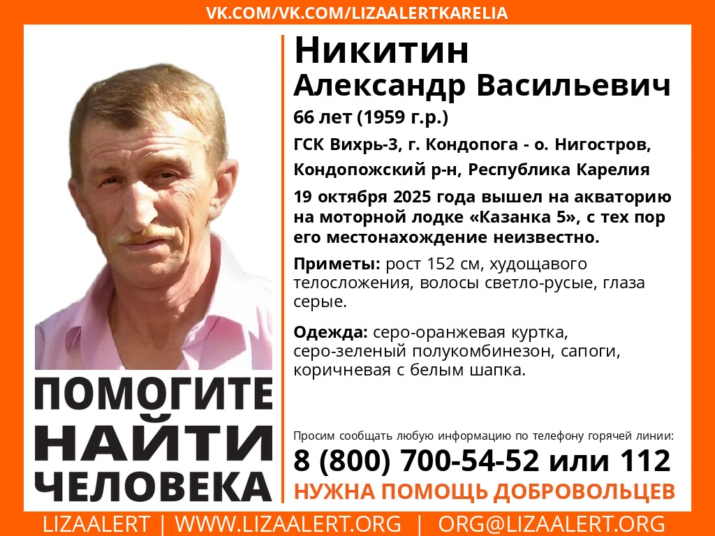 Последний раз его видели 19 октября примерно в 15:00–16:00. Он выехал на моторной лодке «Казанка 5» от кооператива «Вихрь» (озеро Нигозеро) в сторону озера Сандал к острову Нигостров. После этого на связь не выходил. Его лодку нашли напротив острова Нигостров, у берега.