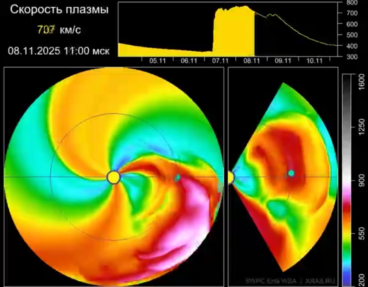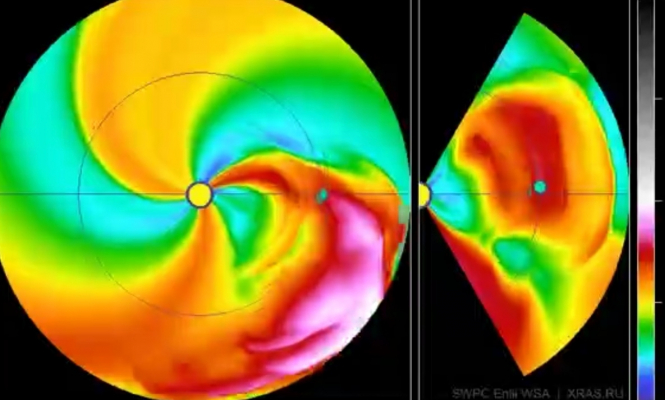 — Впрочем, такой же прогноз они делали и накануне, однако те облака газа, которые должны были пройти в десятках миллионов километров от Земли, прямо сейчас бьют по ней и вызывают сильные бури планетарного масштаба. Визуальный контроль также показывает, что всё выброшенное Солнцем летит к Земле, — пояснили там.