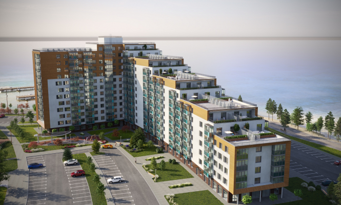 Дом № 19 — самый ожидаемый на территории нового района «Талоярви». Его особенности — первая линия. шикарные прямые виды на Онежское озеро, а также интересная архитектура — здание состоит из блоков различной высоты, от 5 до 14 этажей.
