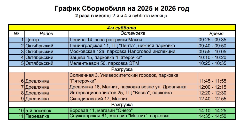 Напомним, об изменениях в графике движения «Сбормобиля» стало известно недавно. В новом сезоне он будет выезжать дважды в месяц, как раньше. Вместо воскресенья рейсы будут выполняться по субботам. Точки сбора разделят на два дня.