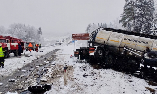 Как мы писали ранее, ДТП произошло около 12:00 на 179-м километре автодороги А-121 «Сортавала». По предварительным данным, водитель грузовика SITRAK, двигаясь в сторону города Лахденпохья, не справился с управлением. Машину занесло, она выехала на встречную полосу, где столкнулась с бензовозом Volvo. После этого в грузовик врезался легковой автомобиль Renault Symbol, который, в свою очередь, столкнулся с Toyota RAV4.