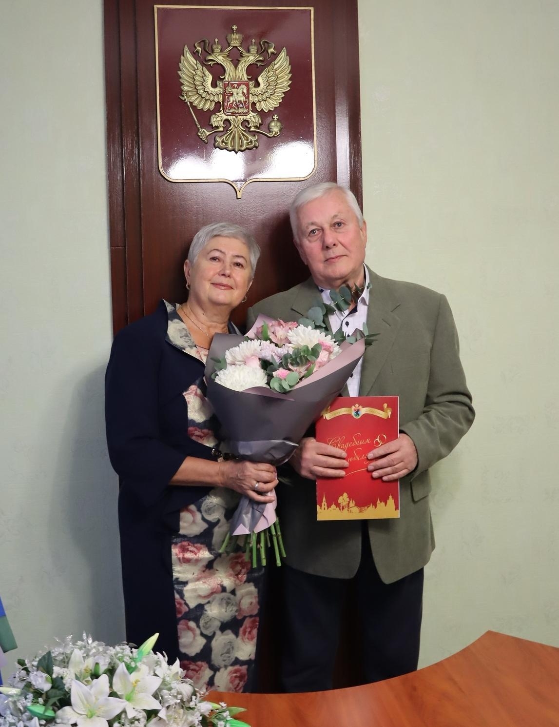Юбилярам вручили поздравительный адрес от главы Карелии Артура Парфенчикова. Супруги оставили памятные подписи в почетной книге свадебных юбиляров.