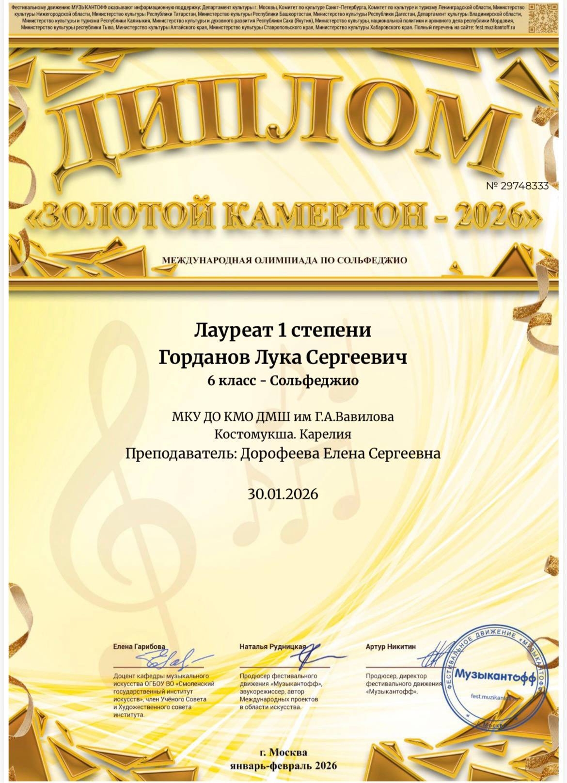 Горданов Лука удостоен звания лауреата I степени на теоретической олимпиаде «Золотой камертон-2026», сообщает Детская Музыкальная Школа им. Г. А. Вавилова.