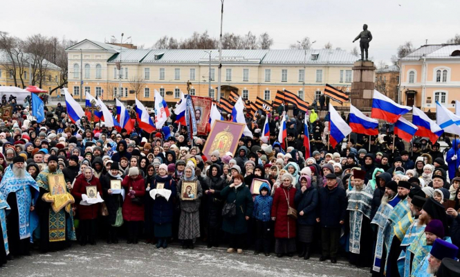 Торжественное шествие в День народного единства во главе с митрополитом Константином и карельским духовенством проводится в Петрозаводске уже второй раз. Напомним, один из самых значимых для жителей России праздников неразрывно связан с событиями 1612 года, когда народное ополчение под предводительством Кузьмы Минина и Дмитрия Пожарского освободило Московский Кремль от польских захватчиков. Это событие стало символом восстановления государственности. В честь воинов, давших отпор самозванцам и интервентам, прошел крестный ход с Казанской иконой Божией Матери.