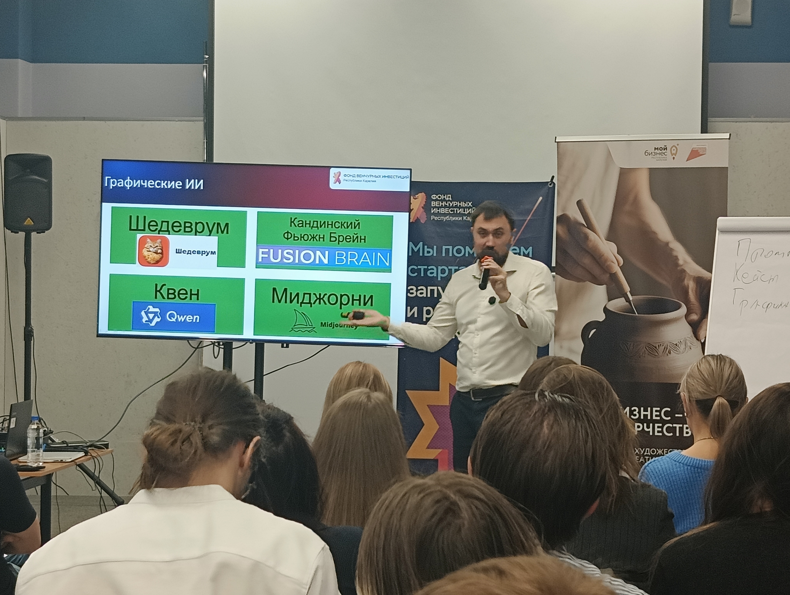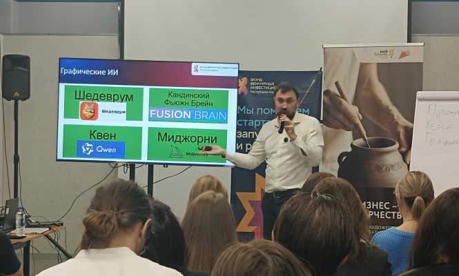Главным спикером стал Алексей Борисов — эксперт по нейросетям и генеративному ИИ, преподаватель Финансового университета при Правительстве РФ, наставник Школы Стартапов «Сколково». Он помогает компаниям внедрять ИИ в повседневную работу. Для слушателей из Петрозаводска он просто и понятно рассказал, что вообще такое ИИ, как делать для него запросы, какие и для чего есть основанные на ИИ нейросети — платные и бесплатные.