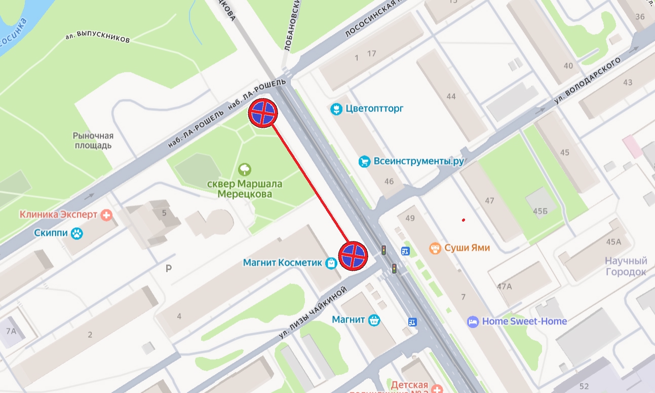 Аналогичные изменения вводятся на перекрестке Красноармейской улицы с улицей Гоголя. Также будет запрещена остановка и стоянка транспорта на четной стороне улицы Маршала Мерецкова от набережной Ла-Рошель до улицы Лизы Чайкиной.