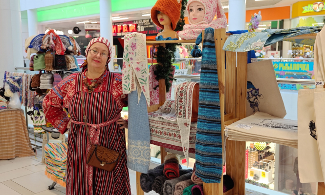 Еще один актуальный подарок — теплые вещи. На ярмарке можно выбрать шапки и рукавицы с оригинальным дизайном. Никуда и без карельской тематики — вышивка с традиционными узорами, народные орнаменты и сувениры с северным характером. Некоторые мастера сами встали за прилавок в костюмах, вдохновленных традиционным карельским костюмом.