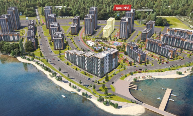 Дом № 8 располагается в центре нового района. Это значит, что будущим жильцам будут открываться не только потрясающие виды на Онежское озеро, но также на благоустроенный парк в 3 гектара с детским игровым комплексом и уникальными арт-объектами.