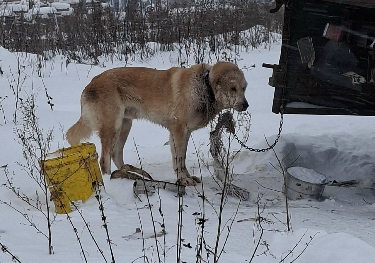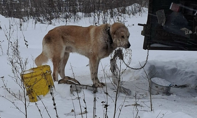 Информация о страдающей собаке (помесь с алабаем), которому перекрутившаяся цепь впилась в шею, рассказали в паблике «Заозерье Карелия». Пес по кличке Малыш живет под старым грузовиком. В комментариях развернулась активная дискуссия. У фермы есть хозяин, арендаторы постоянно меняются. Чья эта собака, как и еще один алабай рядом — никто толком понять не может. Конкретно этого пса ходит кормить общественница, которая написала пост в паблике.