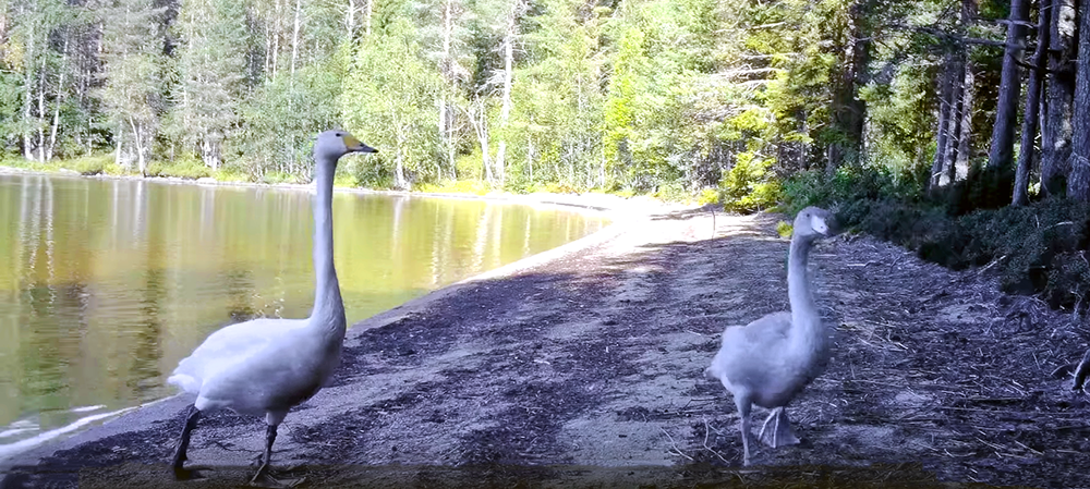 Семья лебедей попала в объектив скрытой камеры видеонаблюдения на берегу одного из озер Костомукшского заповедника на севере Карелии.