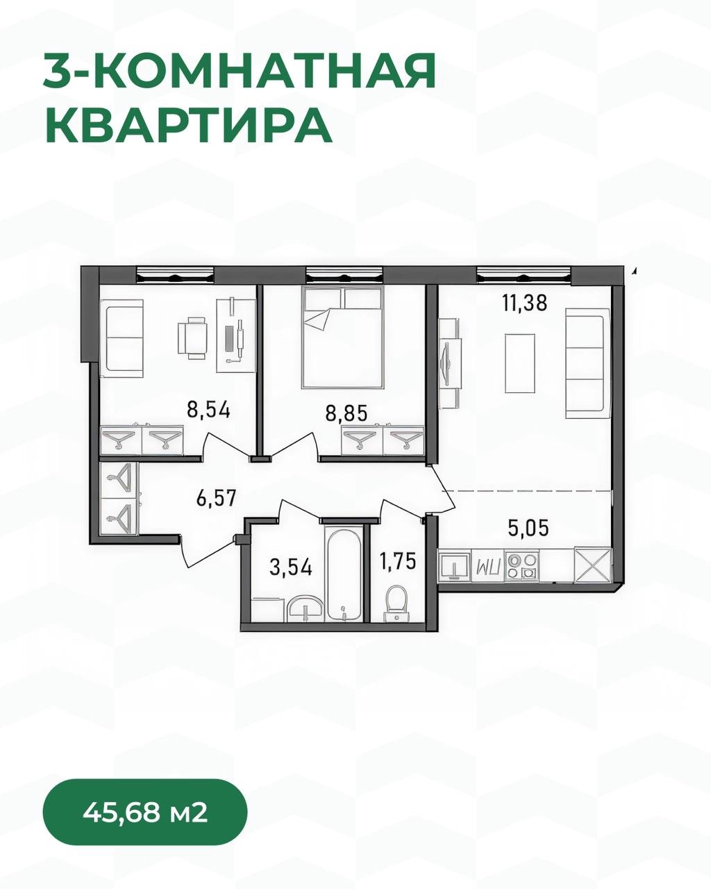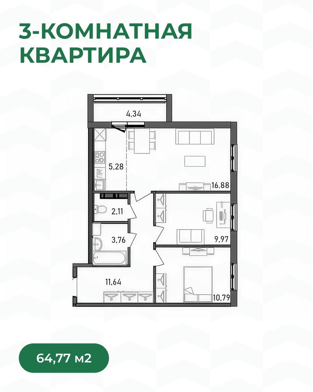 3-комнатные — для семьи с детьми или тех, кто любит пространство «с запасом»: удобные зоны для родителей и детей, гостевая, мастерская или кабинет — всё, что нужно для комфортной жизни.