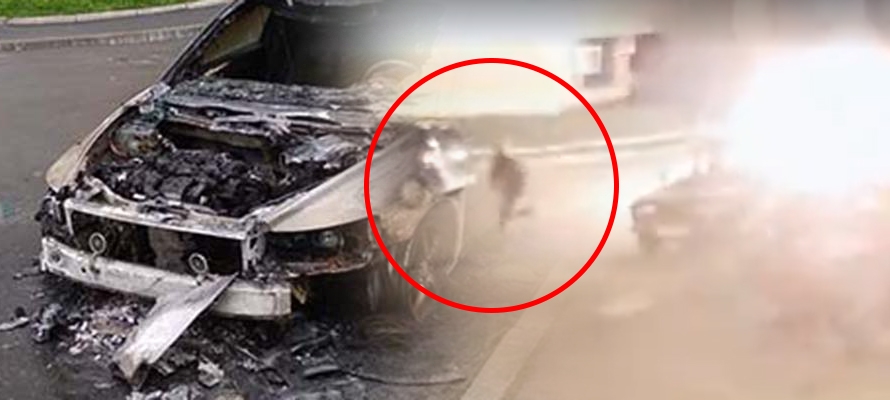 Появилась видеозапись с места произошедшего. По кадрам видно, как неизвестный обливает автомобиль бензином и поджигает.