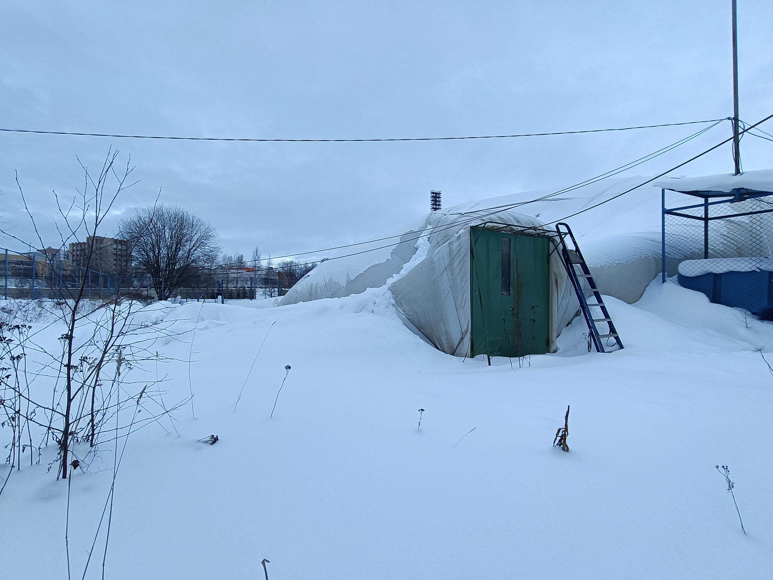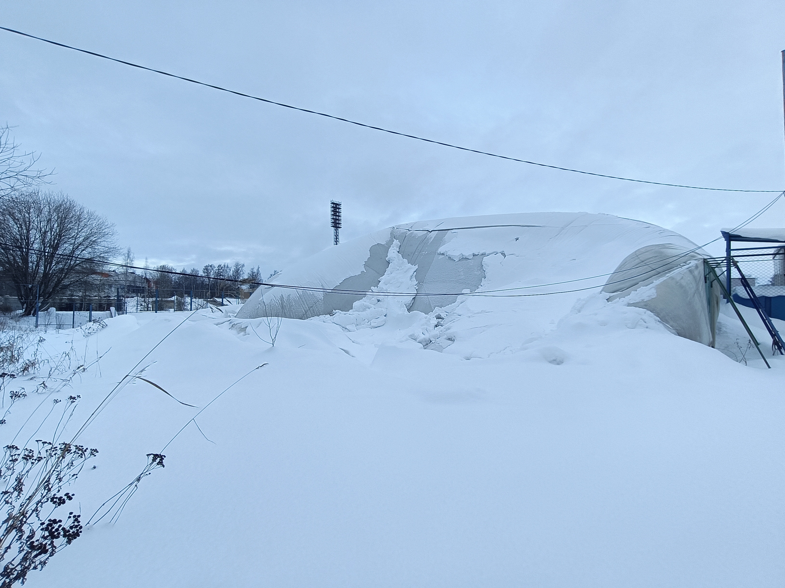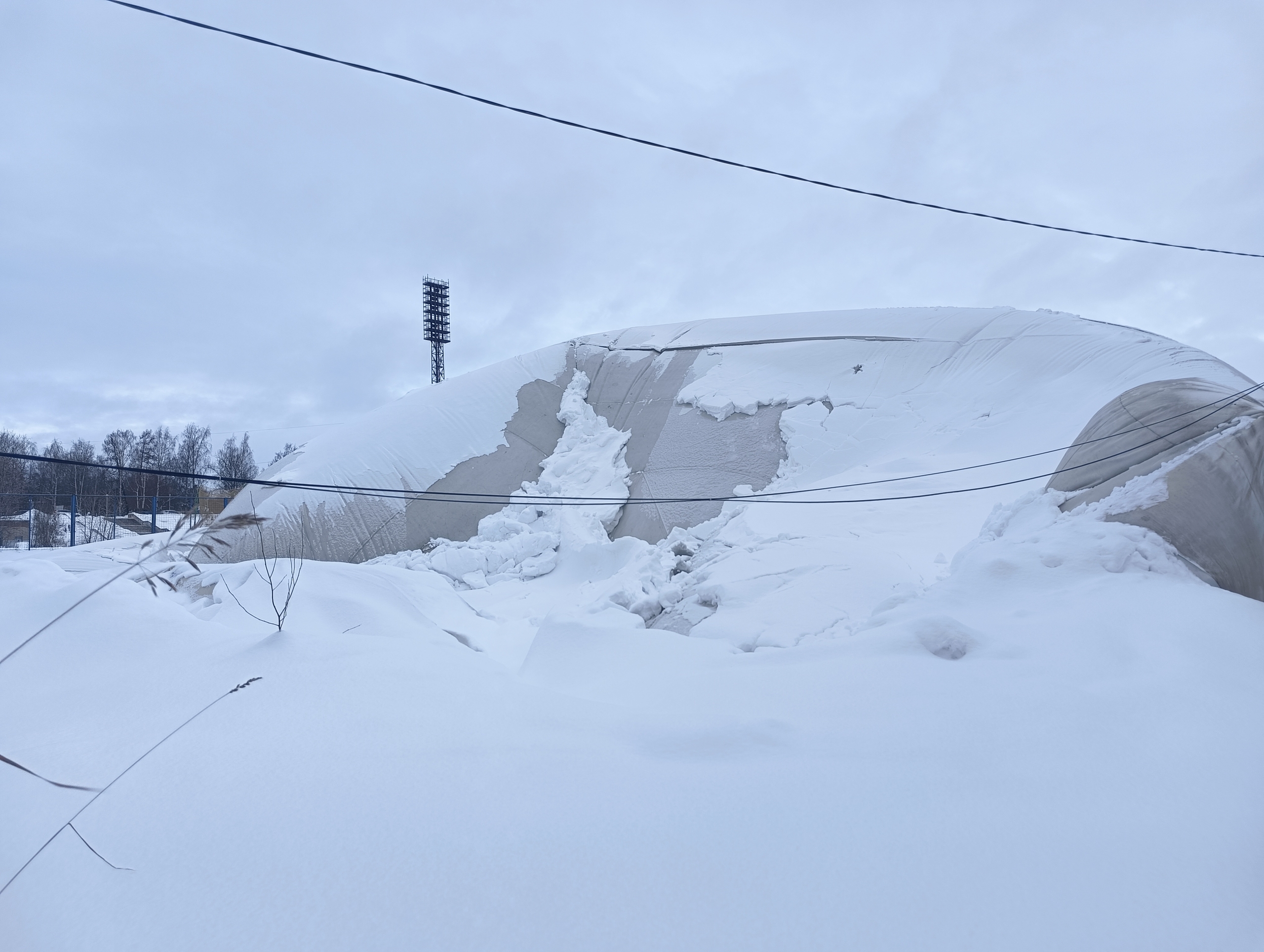 В распоряжении редакции «Столицы на Онего» оказались фотографии, сделанные сегодня днем около спортивного объекта. На снимках видно, что купол упал, на нем лежит снег, вокруг — сугробы.
